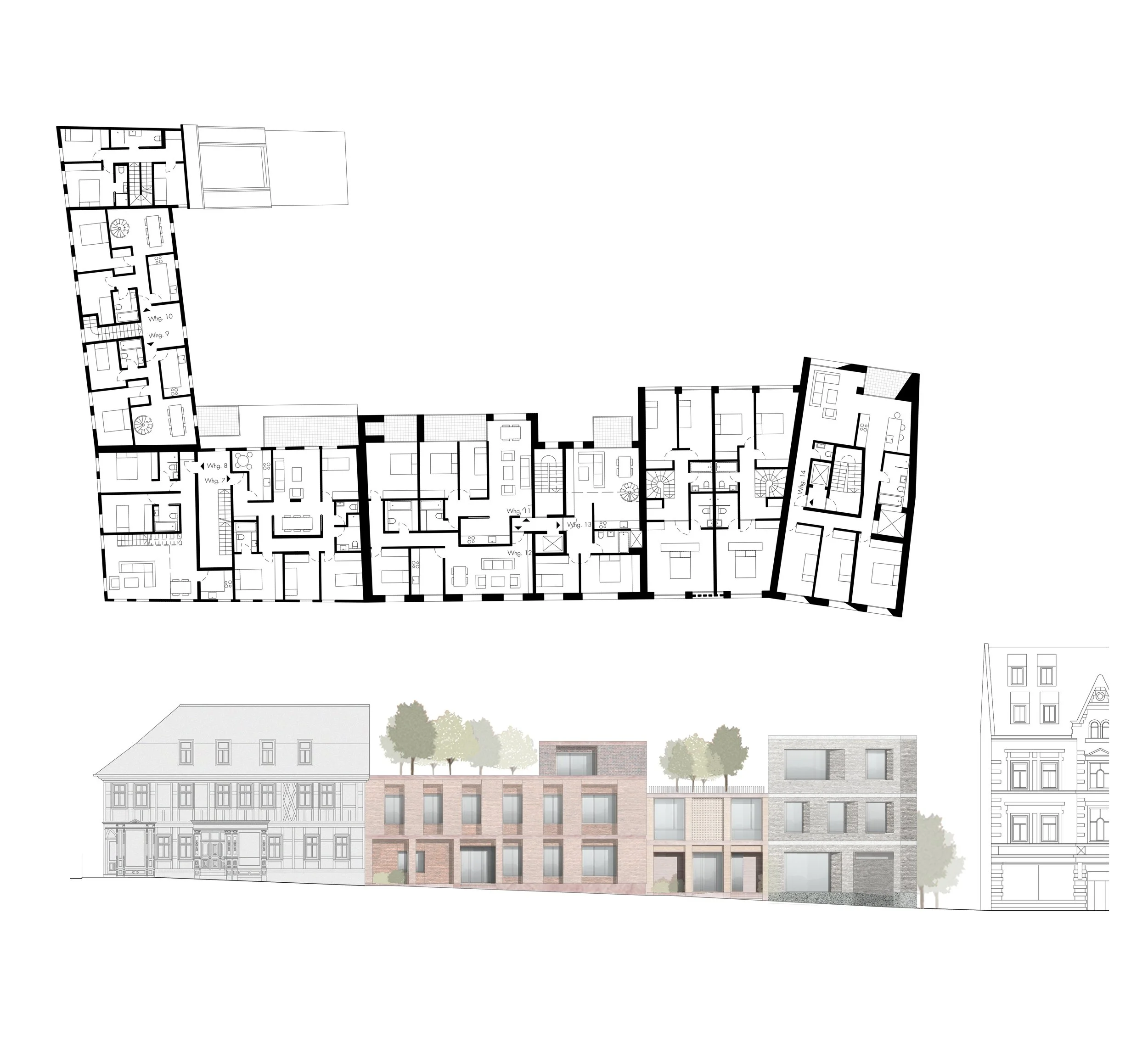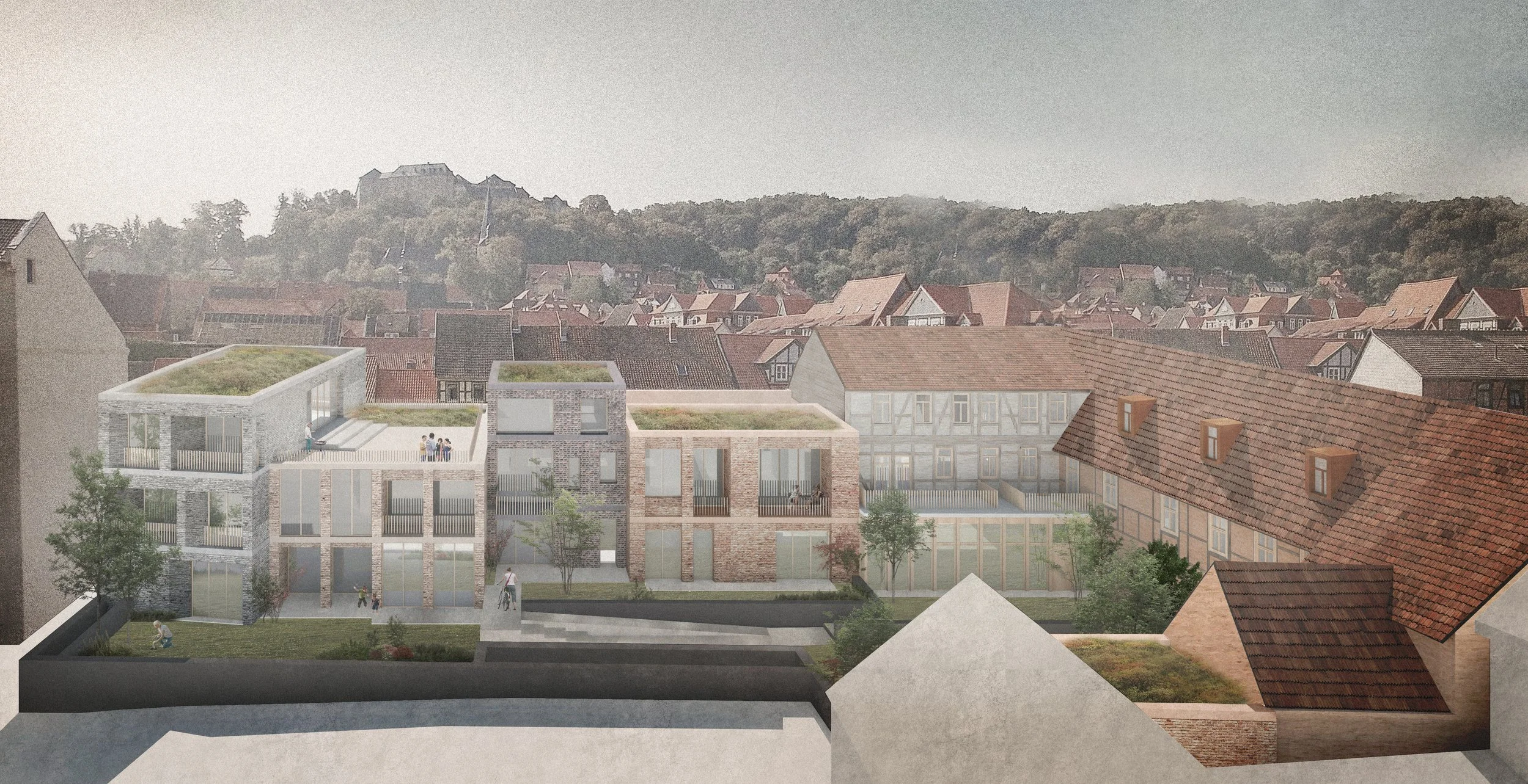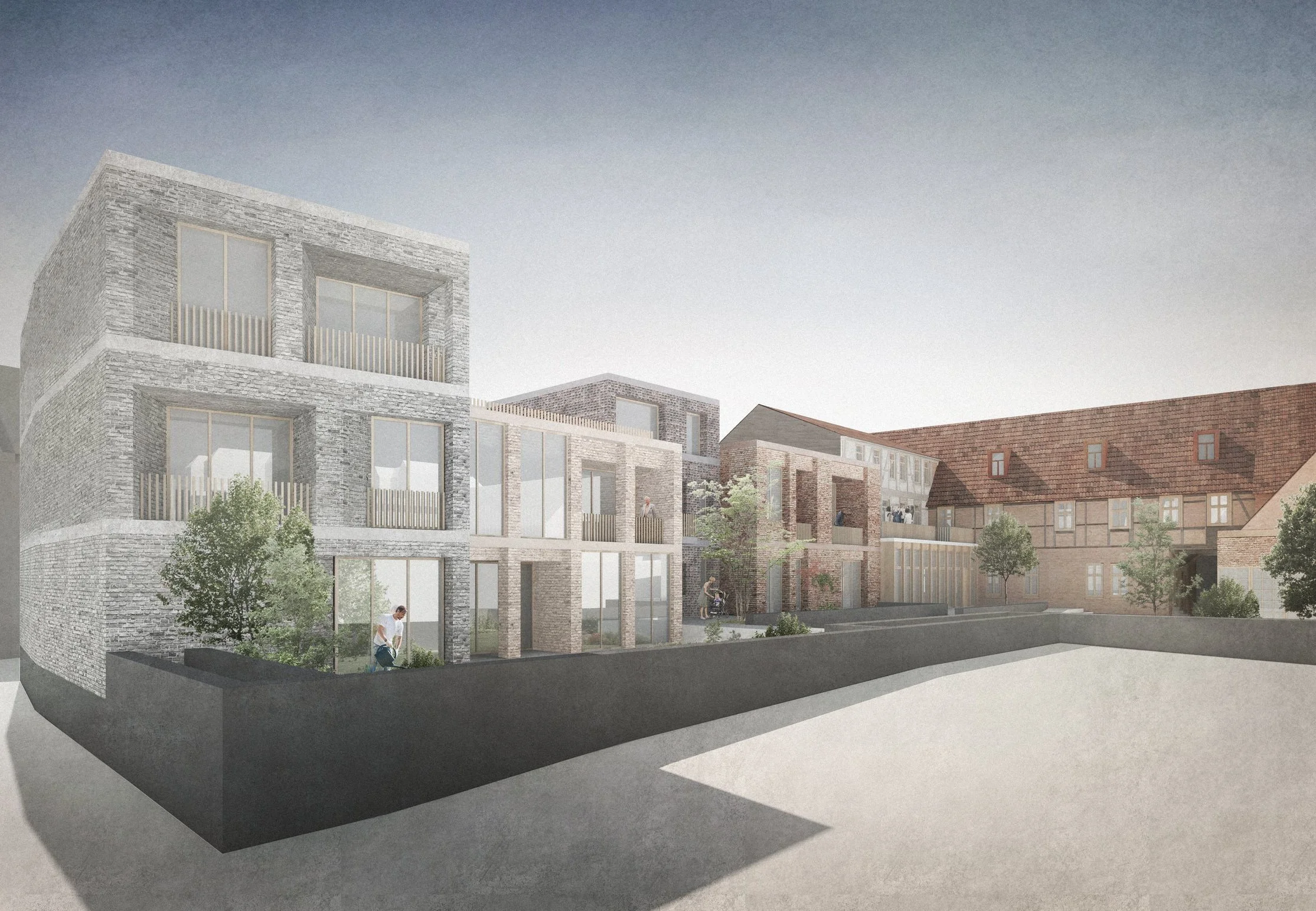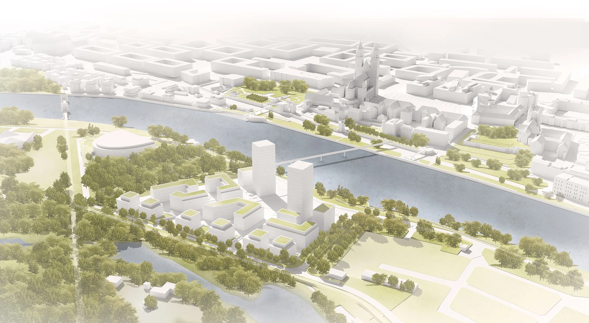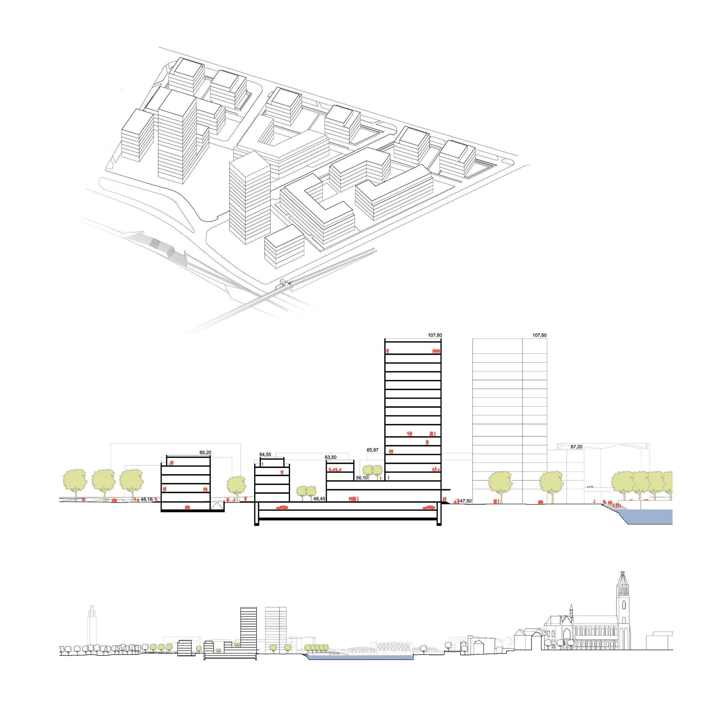 Masterplan for a plot in the German city of Magdeburg. Our proposal includes high quality public spaces and mixed use (residential + co-working + office) buildings. Designed with an aim to connect two disjointed areas of the town, the proposal reinstates a modern interpretation of the once existing city wall generating a space for commerce within it. Accessibility for all and sustainability are at the core of the design.